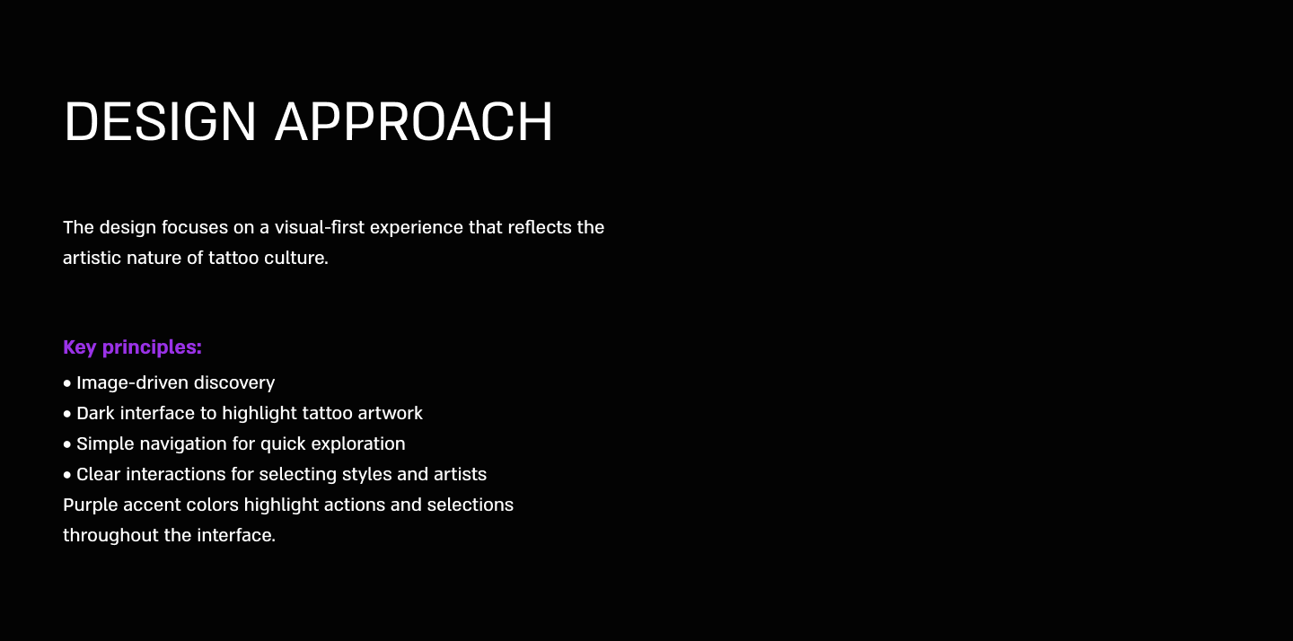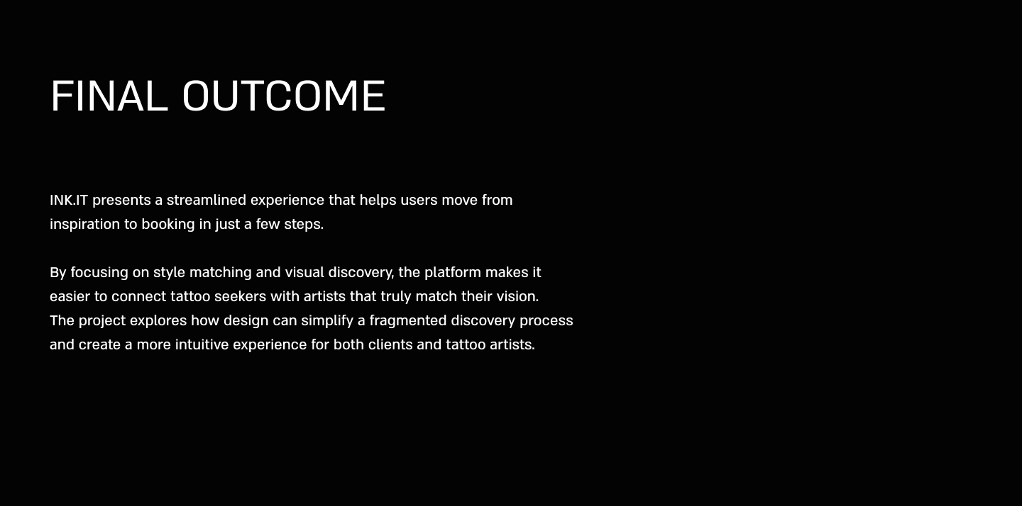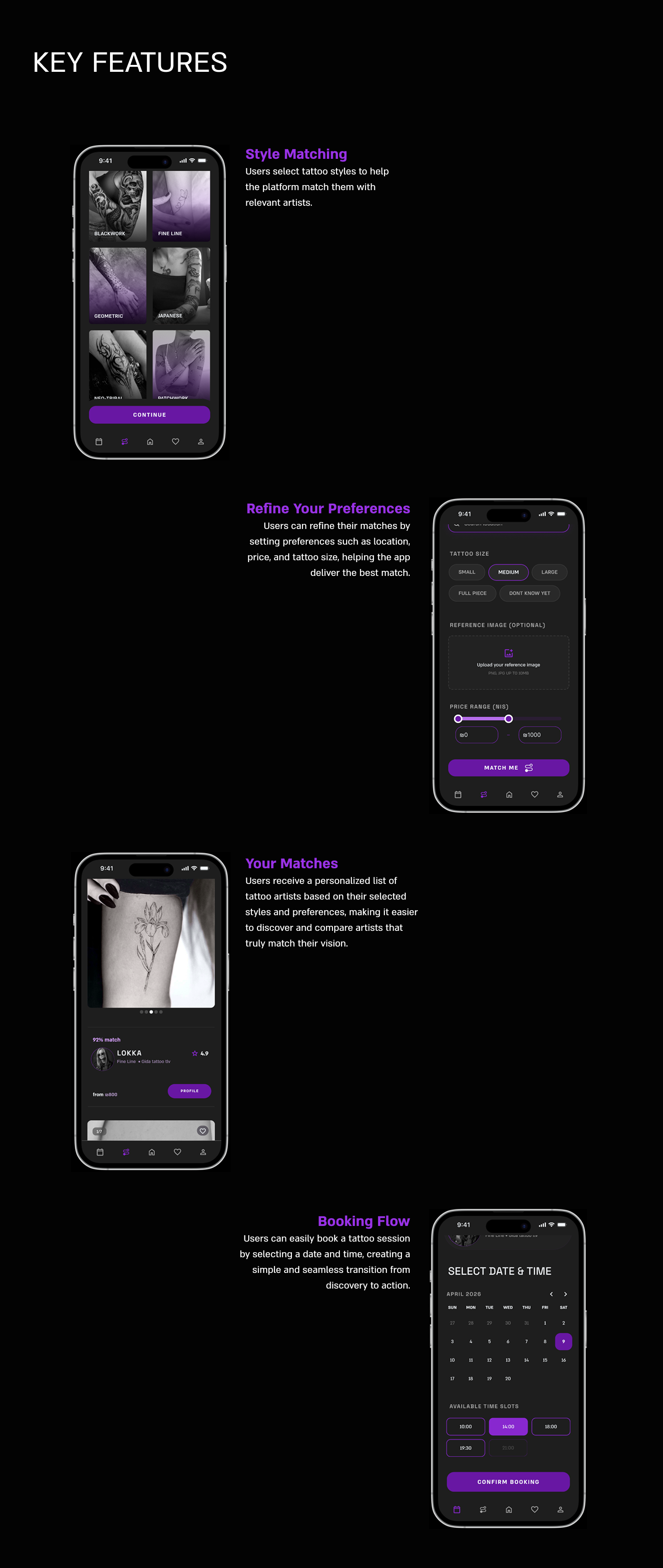 A UX/UI project focused on improving the way users discover and book tattoo artists. The platform matches users with artists based on style and preferences, combining a clear, structured experience with a distinctive visual identity.
