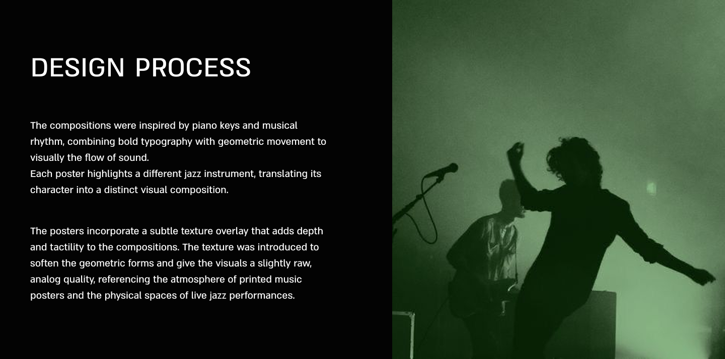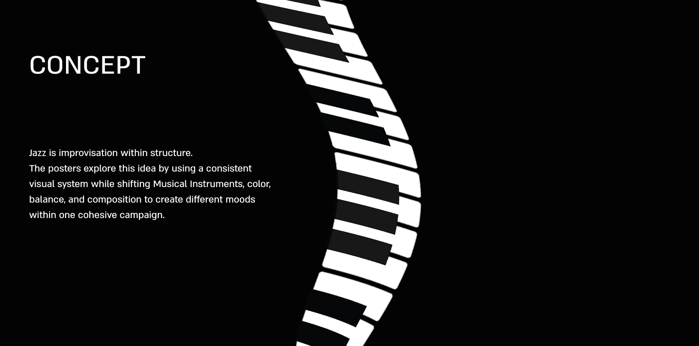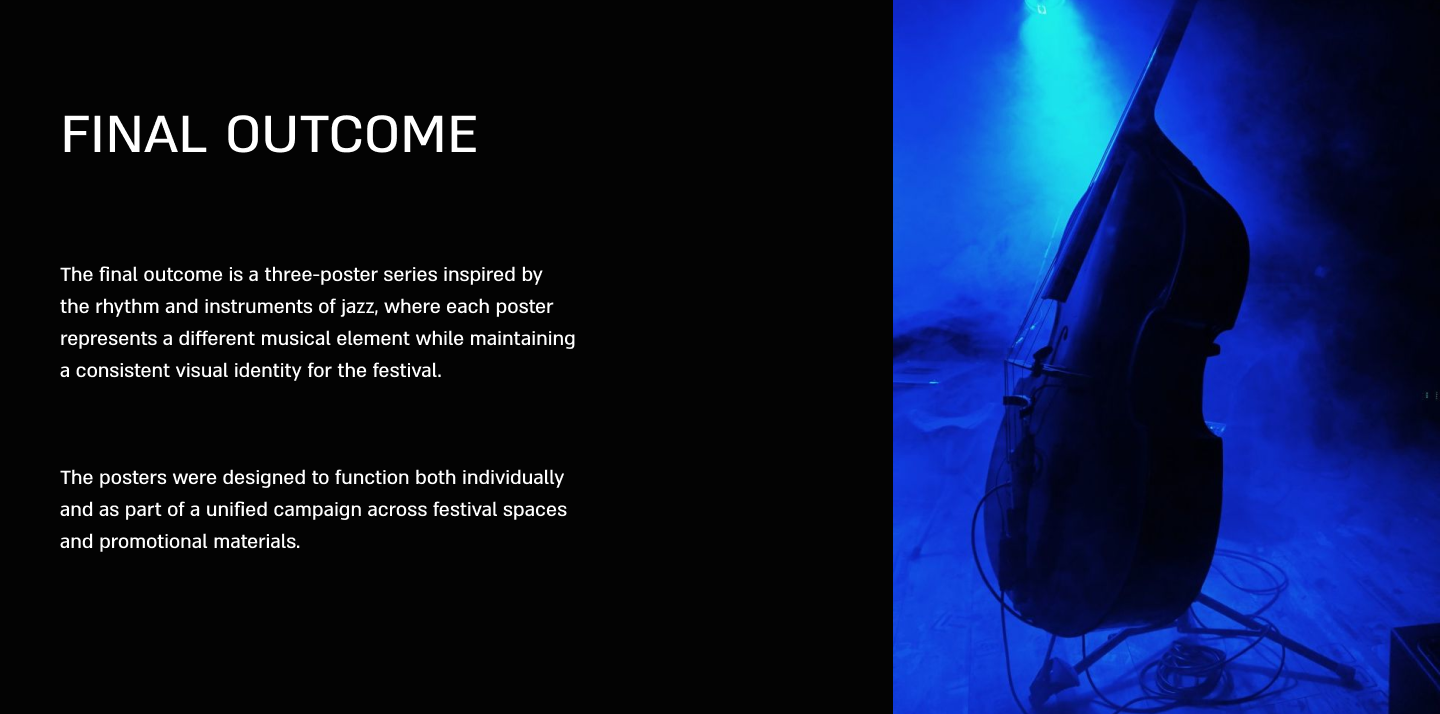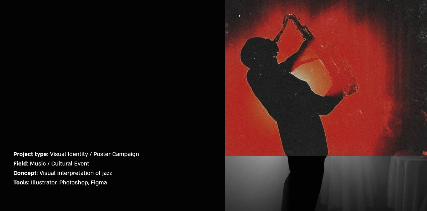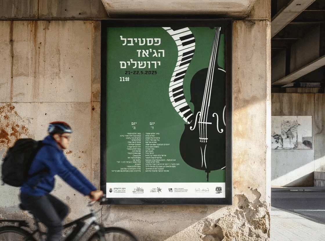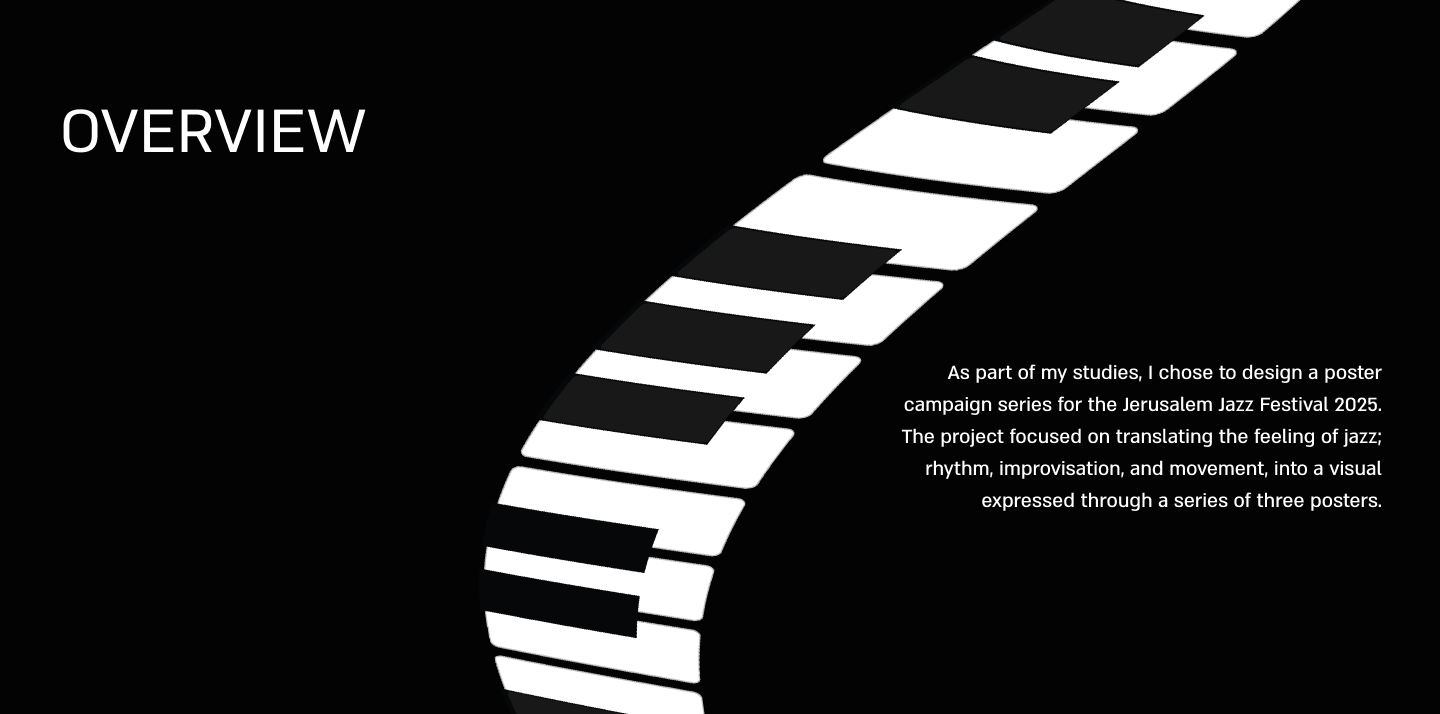 A visual communication project for the Jerusalem Jazz Festival. The poster series explores rhythm and movement through typography and composition, creating a cohesive yet flexible visual system.